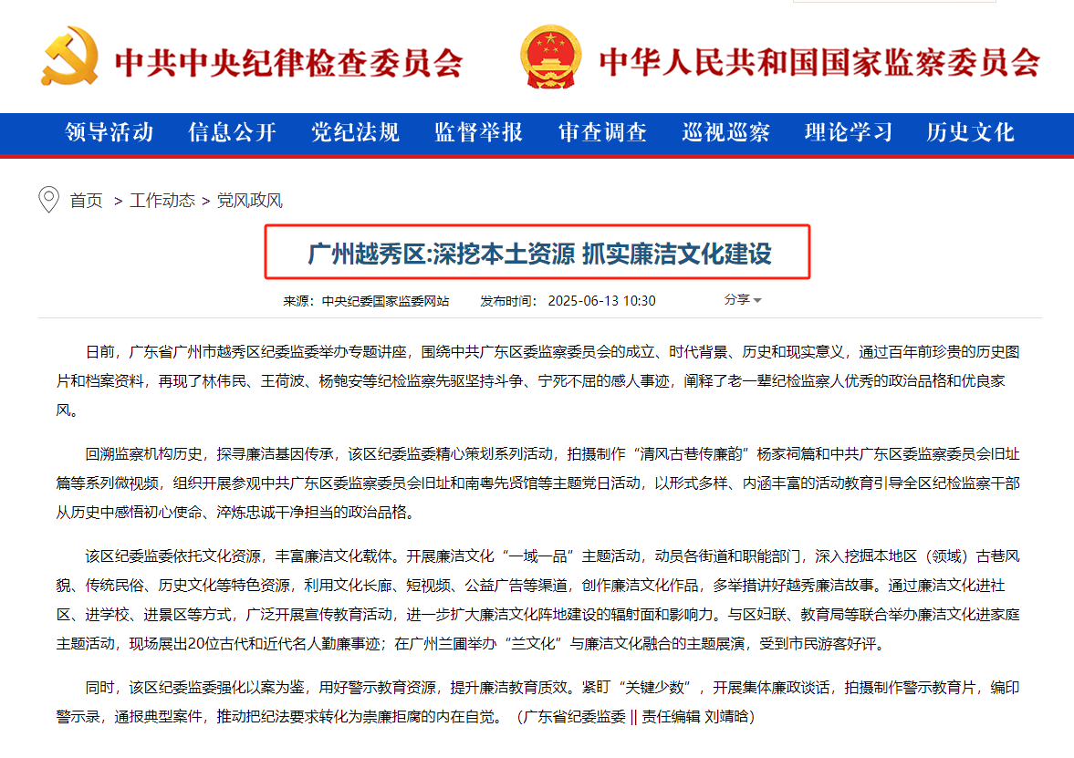 回溯监察机构历史,探寻廉洁基因传承,该区纪委监委精心策划系列活动,拍摄制作“清风古巷传廉韵”杨家祠篇和中共广东区委监察委员会旧址篇等系列微视频,组织开展参观中共广东区委监察委员会旧址和南粤先贤馆等主题党日活动,以形式多样、内涵丰富的活动教育引导全区纪检监察干部从历史中感悟初心使命、淬炼忠诚干净担当的政治品格。